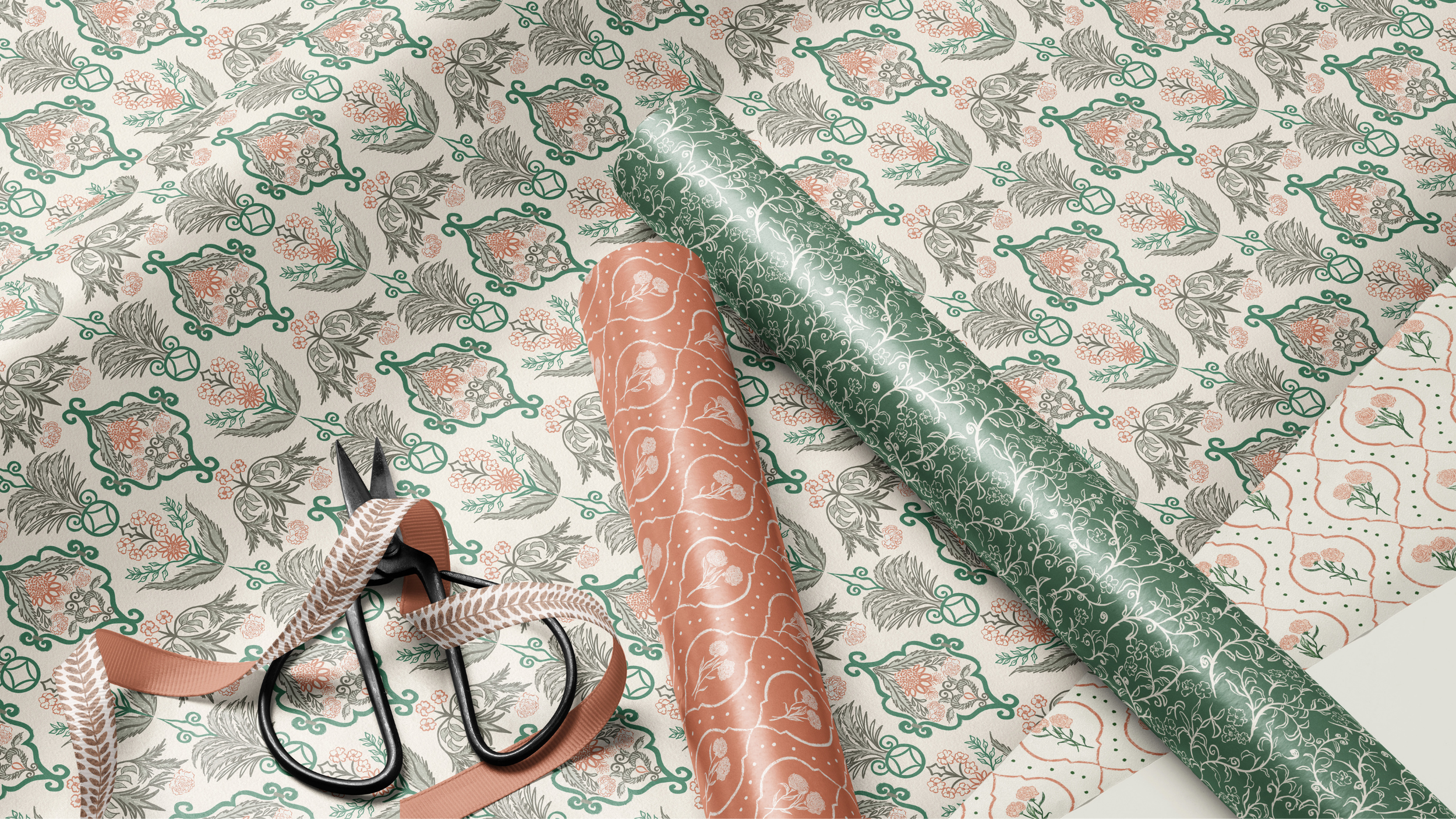 A design collection captures the timeless elegance of Chinoiserie! This surface pattern collection is full of hand-drawn details including garden scene art, trailing branches with leaves and flowers botanical patterns, and ikat damask eastern-inspired pattern. Available in variety of colorways.